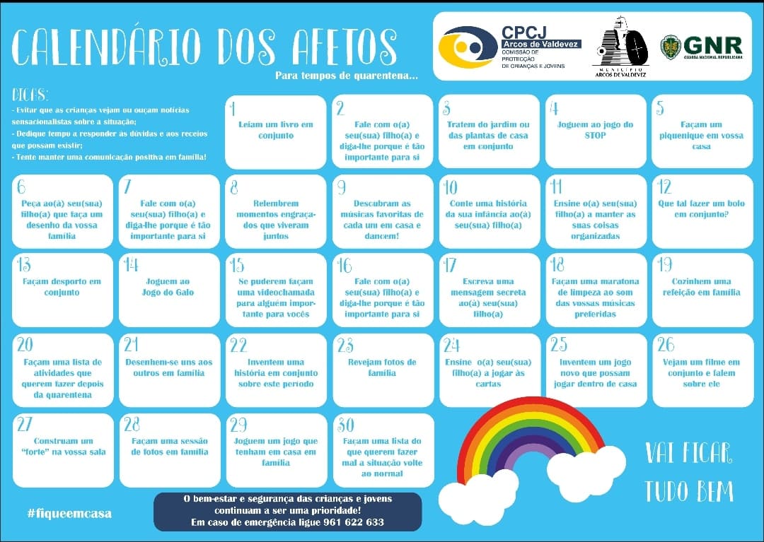A CPCJ de Arcos de Valdevez lança o desafio às famílias que neste momento estão resguardadas em suas casas, de abraçar as sugestões deste calendário dos afetos... Com amor e união esta fase será mais fácil de ultrapassar ❤️