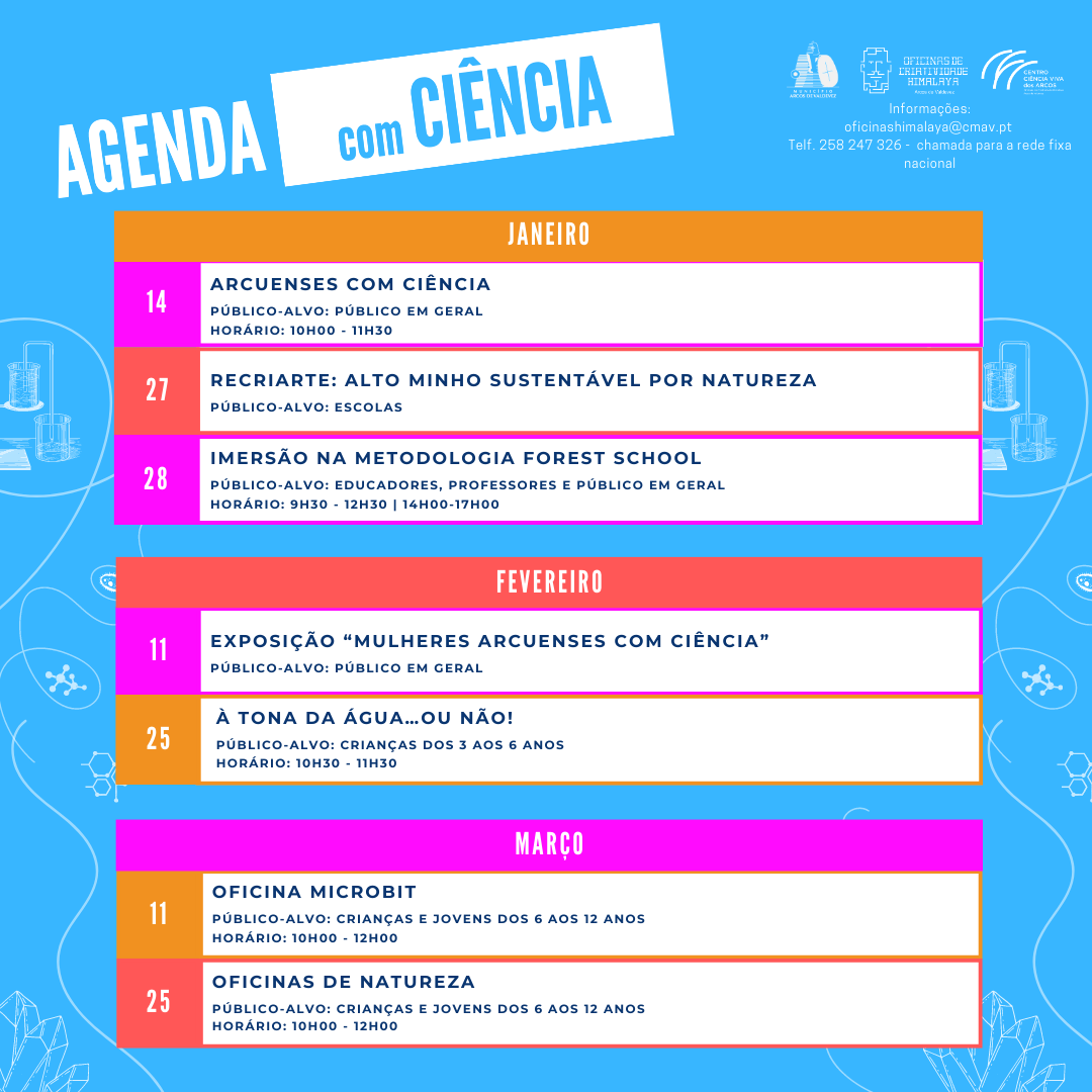 Já o mês de março está reservado para os verdadeiros engenheiros e exploradores da natureza, que através de duas oficinas distintas vão debruçar-se sobre a contagem do tempo com a programação de Microbits, e aproveitar o melhor da primavera.