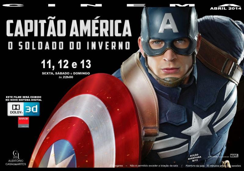 11, 12 e 13sexta, sábado e domingo às 22h00CAPITÃO AMÉRICA: O SOLDADO DO INVERNOGénero: Acção, aventuraRealização: Anthony Russo, Joe RussoCom: Chris Evans, Cobie Smulders, Robert Redford, Samuel L. Jackson, Scarlett Johansson, Stan Lee