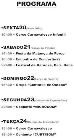 No sábado, dia 21 de Fevereiro, terá lugar no Largo da Valeta, pelas 16h00, a Festa da Matança do Porco. De seguida, pelas 16h30 realizar-se-á um encontro de concertinas e à noite pelas 22h00, decorrerá um Festival de Karaoke, Baile e ainda, a participação de vários DJ's que animarão o resto do serão. Programa