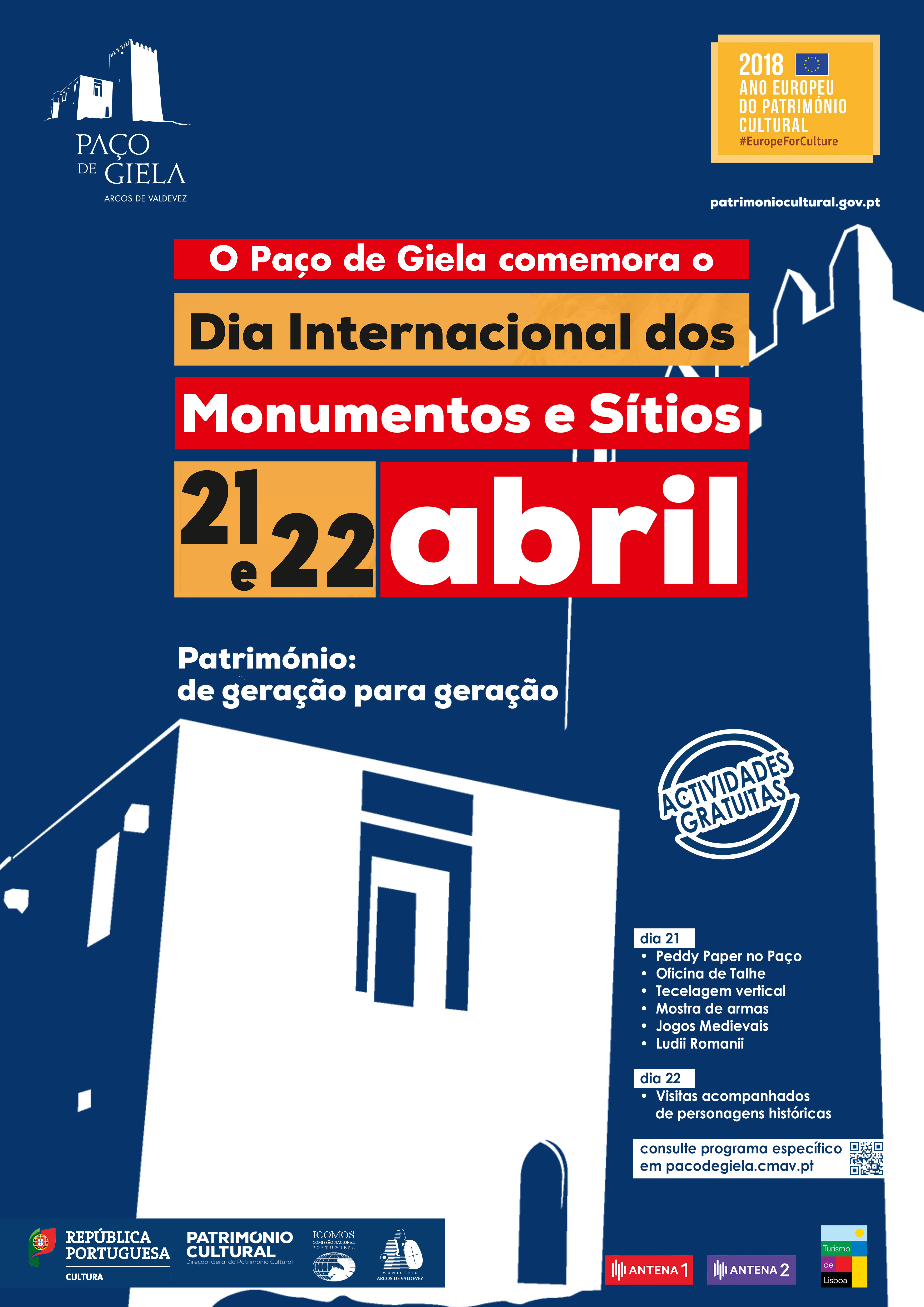 O Paço de Giela associa-se, mais uma vez, às comemorações do Dia Internacional dos Monumentos e Sítios, criado pelo ICOMOS a 18 de abril de 1982 e aprovado pela UNESCO no ano seguinte. Esta comemoração tem como objetivo sensibilizar o público para a diversidade e vulnerabilidade do património, bem como para o esforço envolvido na sua proteção e conservação. Para assinalar esta data, o Paço de Giela oferece um conjunto de atividades, nos dias 21 e 22 de abril.