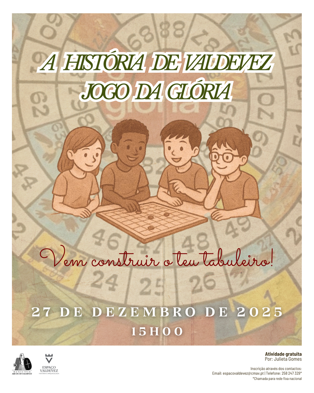 Após uma breve visita ao Espaço Valdevez, cada criança terá a oportunidade de criar o seu próprio tabuleiro de jogo, inspirado no tradicional Jogo da Glória.