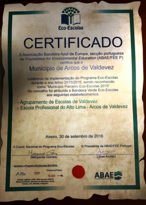 No ano letivo 2015/2016, foi atribuída a Bandeira Verde Eco Escolas à EPRALIMA e ao Agrupamento de Escolas de Valdevez, a quem o Município reconhece o trabalho efetuado e deixa um voto de incentivo à sua continuidade.