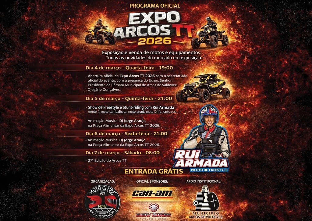 À semelhança do ano anterior, o MCAV volta a apostar na EXPO ARCOS TT – Feira Mostra de Motos, com entradas livres e gratuitas, onde serão apresentadas as últimas novidades do mercado e do mundo das duas e quatro rodas. A programação deste ano inclui ainda um dos momentos mais aguardados do evento: um espetáculo de freestyle e stunt riding pelo piloto Rui Armada, a realizar-se no dia 5 de março à noite.