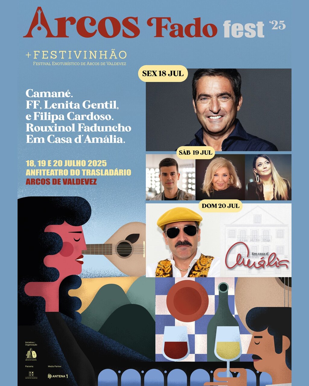 Os destaques vão naturalmente para as noites de 18, 19 e 20 de julho, com os concertos no palco principal de Camané, o “O Fado, a Canção e a Revista”, com Lenita Gentil, FF e Filipa Cardoso, uma produção única e exclusiva de Tiago Machado e de Marco Rodrigues, tambem ele curador do festival; na última noite, o festival recebe, para despedida, o programa da RTP “Na Casa d’Amália”.