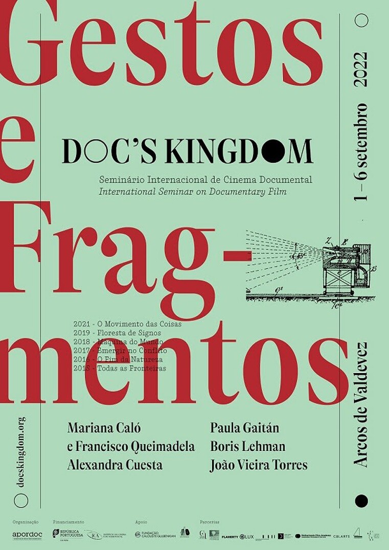 Com a presença de Boris Lehman, Paula Gaitán, Mariana Caló e Francisco Queimadela, Alexandra Cuesta e João Vieira Torres e reunindo uma comunidade internacional, o “Doc’s Kingdom ’22 - Gestos e Fragmentos”, a partir da obra homónima de Alberto Seixas Santos, propõe 6 dias de projeções com três sessões de cinema diárias, seguidas de debates e de programas-convívio informais entre autores e participantes, num espaço onde o seminário encontra a sua força e forma singulares.