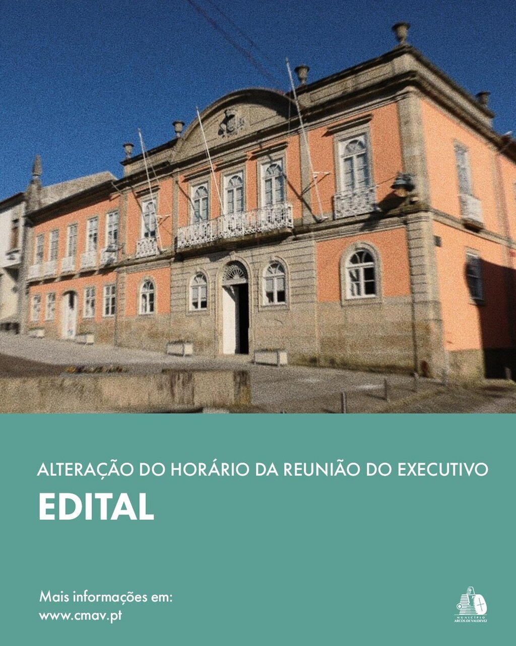 Olegário Gomes Gonçalves, Presidente da Câmara Municipal de Arcos de Valdevez, torna público, nos termos e para efeitos do disposto nos nº 2 e 4 do artigo 40° da Lei n° 75/2013, de 12 de setembro, que a reunião de Câmara prevista para as 14h30 do próximo dia 13 de março de 2026 sofreu alteração de horário para as 17h30.