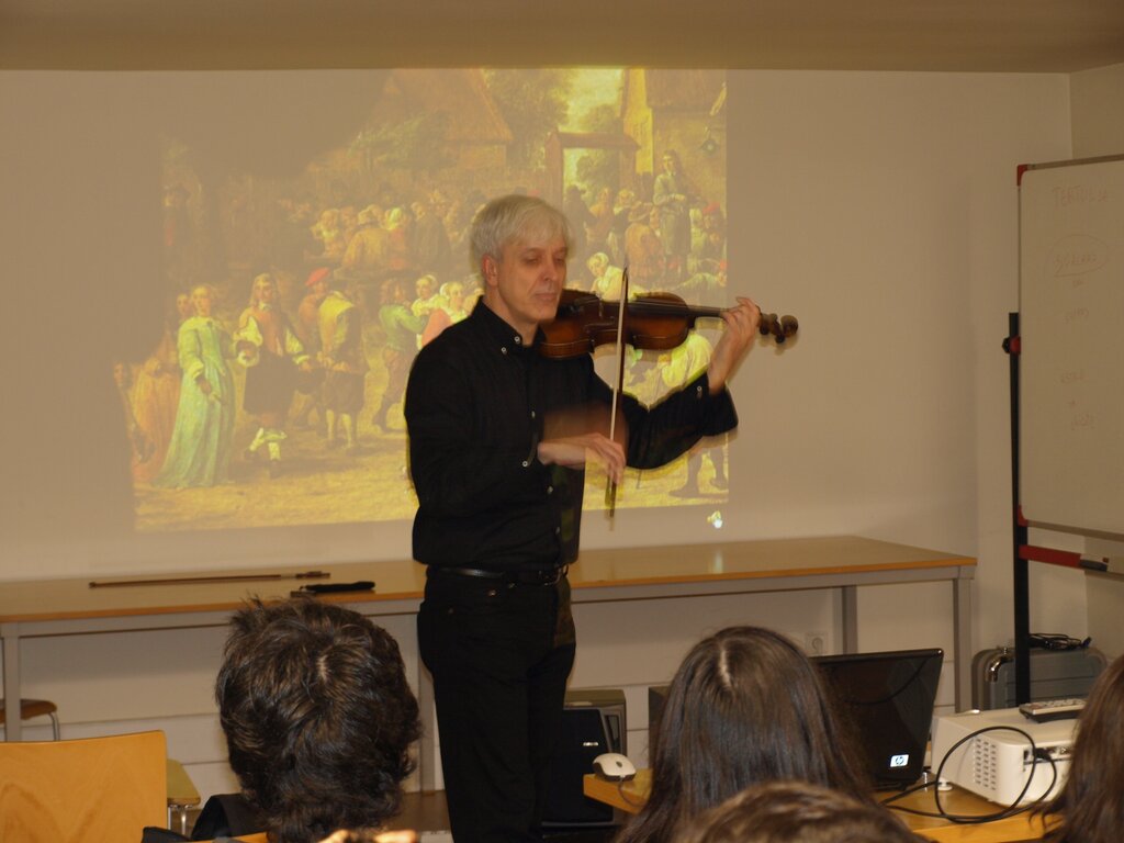 Na sessão “Música e Sociedade – Barroco” os alunos puderam ficar a conhecer um pouco melhor os lugares da música (Do teatro privado ao teatro público; O nascimento do violino e a orquestra barroca); Itália (Veneza e o nascimento do teatro público; Instrução musical pública e privada); França (Música e absolutismo político na corte de Luís XIV); Alemanha (J.S.Bach, o jazz, o rap e o rock); Inglaterra (G.F.Händel; Da Ópera do Mendigo à Ópera dos três vinténs) e as Vozes do teatro: os “castrati”.