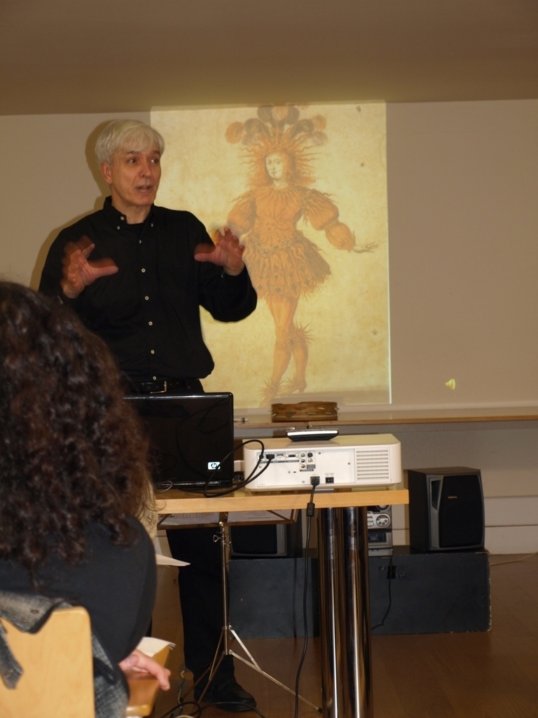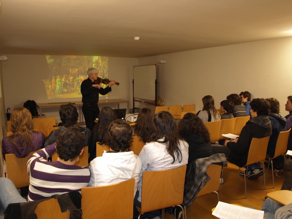 Já na acção didáctica dedicada à “Música e Sociedade – Idade Média”, Maurizio falou dos Lugares da música: a Igreja (Nascimento da notação musical; da monodia à polifonia; música litúrgica e música fé popular); os Lugares da música: o castelo (música e poesia (séc.XII e XIII): trovadores; Martin Codax e as cantigas de amigo); Os lugares da música: a rua, a praça, a taverna (O nascimento das universidades; Jograis, estudantes e clérigos errantes; Carmina Burana) e os Instrumentos Musicais.
