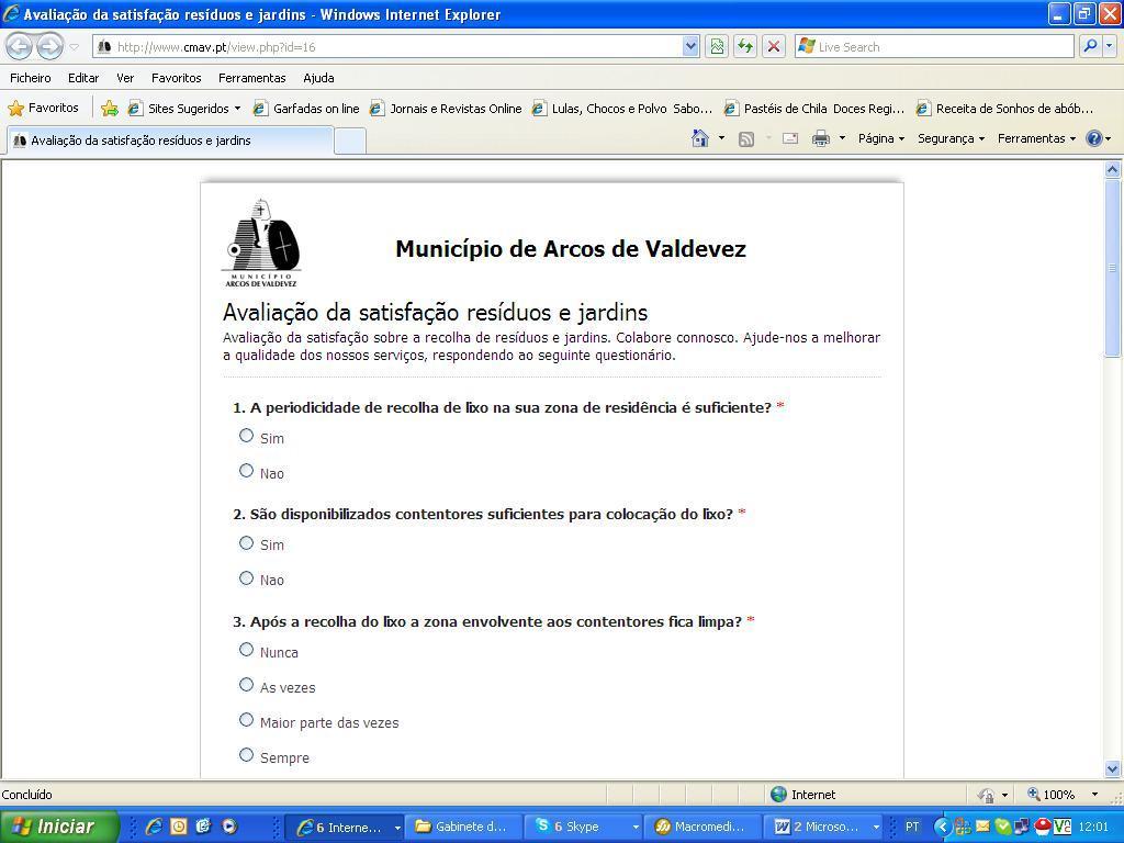 Quem quiser opinar acerca da recolha de resíduos e jardins, dos serviços prestados nas piscinas municipais ou relativamente aos serviços prestados nos Paços do Concelho, apenas terá de aceder ao menu Inquéritos de Satisfação, que se encontra na home page do sítio da Câmara Municipal, e preencher o respectivo formulário. De imediato este será reencaminhado para a técnica responsável do Serviço de Qualidade que os fará chegar ao pessoal indicado para resolver as questões.