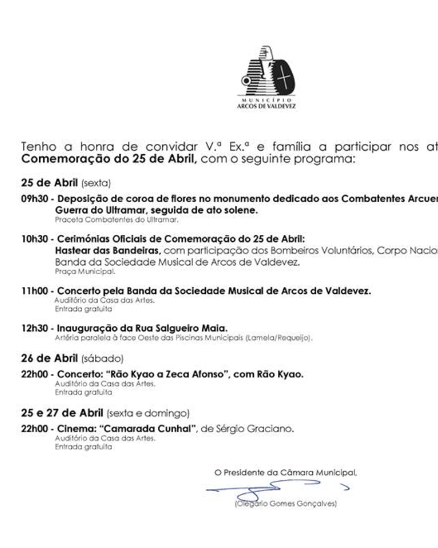 Tenho a honra de convidar V. Excelência e Família a participar nos atos relativos à Comemoração do Dia do Concelho 2022, com o seguinte programa: