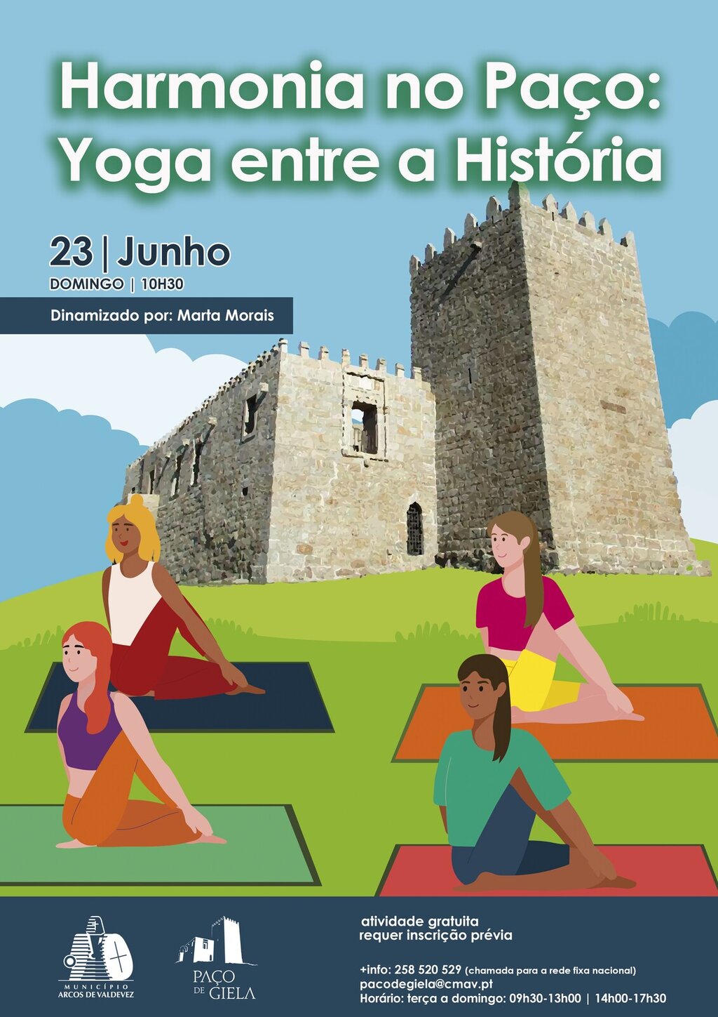 O Paço vai proporcionar uma sessão de yoga relaxante e rejuvenescedora, uma experiência de bem-estar e revitalizante para todos aqueles que queiram participar. Durante esta experiência, os participantes serão levados a uma conexão mente-corpo, terão a oportunidade de praticar posturas suaves, técnicas de respiração e meditação, tudo enquanto absorvem a atmosfera tranquila e serena do Paço e zona envolvente. Esta fusão única de yoga e história proporcionará uma experiência profunda de relaxamento, inspiração e consciência. Esta é uma oportunidade imperdível para experimentar a harmonia entre o corpo, a mente e a história num ambiente único.