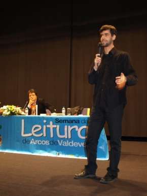 O autor das "Crónicas de Allarya" e adepto da literatura fantástica teve uma conversa, moderada pelo professor universitário Sérgio Sousa (ILCH - Universidade do Minho), com os alunos do 11º ano da EB 2,3/S de Arcos de Valdevez (11ª A, C; D, E, F, G; H, I) e da Epralima (Curso de T. de Comunicação, Marketing, Relações Públicas e Publicidade / Curso T. de Organização de Eventos), na qual falou do acto de escrever, sobre as suas obras e da forma espontânea com que foram surgindo.