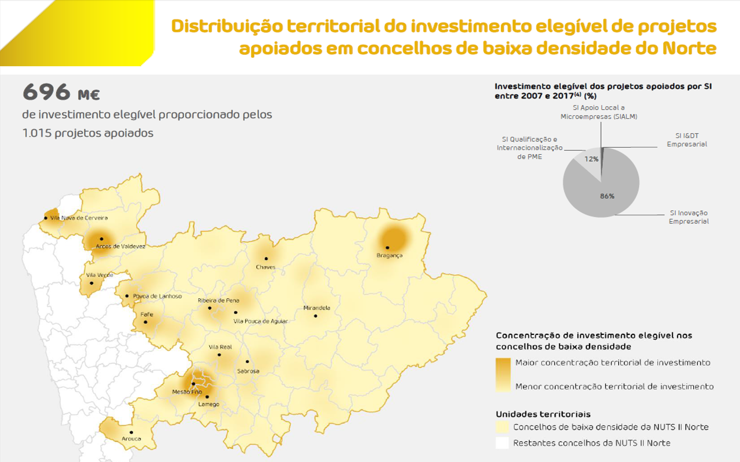 Aos projetos apoiados na região Norte, corresponde um volume de investimento de quase 700 milhões de euros, concentrando-se mais de 1/3 deste valor nos concelhos de Arcos de Valdevez, Bragança e Mesão Frio. A maior dinâmica de financiamento incidiu sobre setores exportadores como o turismo, o automóvel, a metálica e o alimentar.