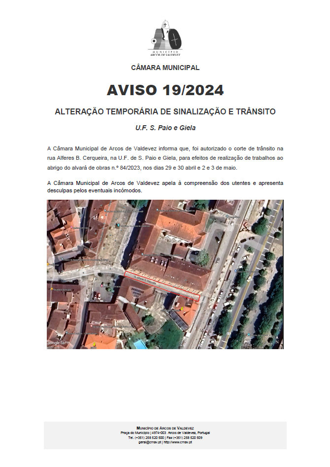 A Câmara Municipal de Arcos de Valdevez informa que, foi autorizado o corte de trânsito na rua Alferes B. Cerqueira, na U.F. de S. Paio e Giela, para efeitos de realização de trabalhos ao abrigo do alvará de obras n.º 84/2023, nos dias 29 e 30 abril e 2 e 3 de maio.
