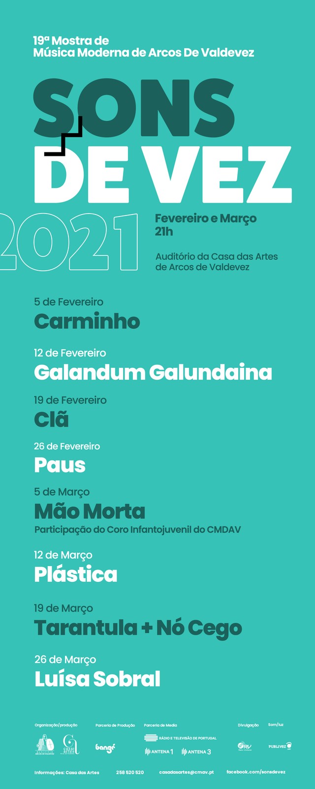 Depois de um ano atípico e pleno de condicionamentos, o festival Sons de Vez retorna nos meses de Fevereiro e Março à Casa das Artes de Arcos de Valdevez e celebra a sua 19ª edição, em toda a segurança, recuperando alguns dos projetos que não chegaram a palco no ano passado e com outras novidades já confirmadas, celebrando o melhor da música nacional.