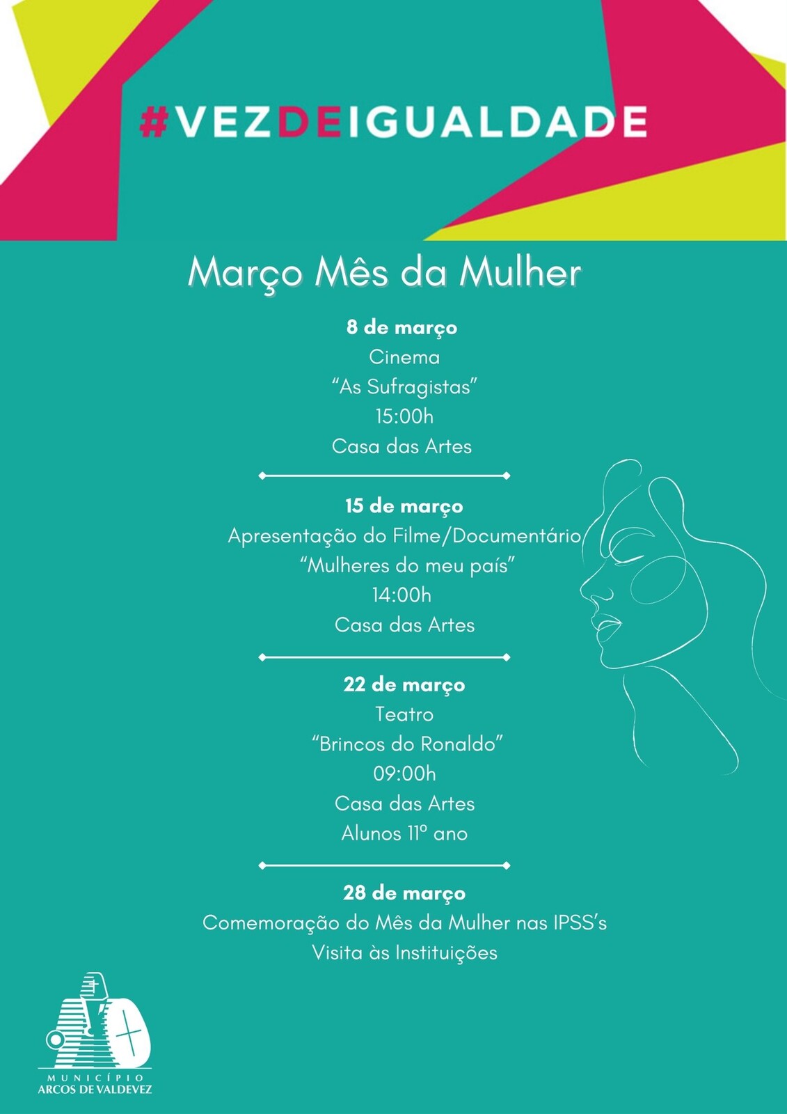 Com o aproximar da comemoração do Dia Internacional da Mulher, 8 de março, o Município de Arcos de Valdevez, decidiu promover um conjunto de iniciativas durante o mês de março, como reconhecimento e homenagem à força, à resiliência, às conquistas e ao papel fundamental das mulheres na sociedade.
