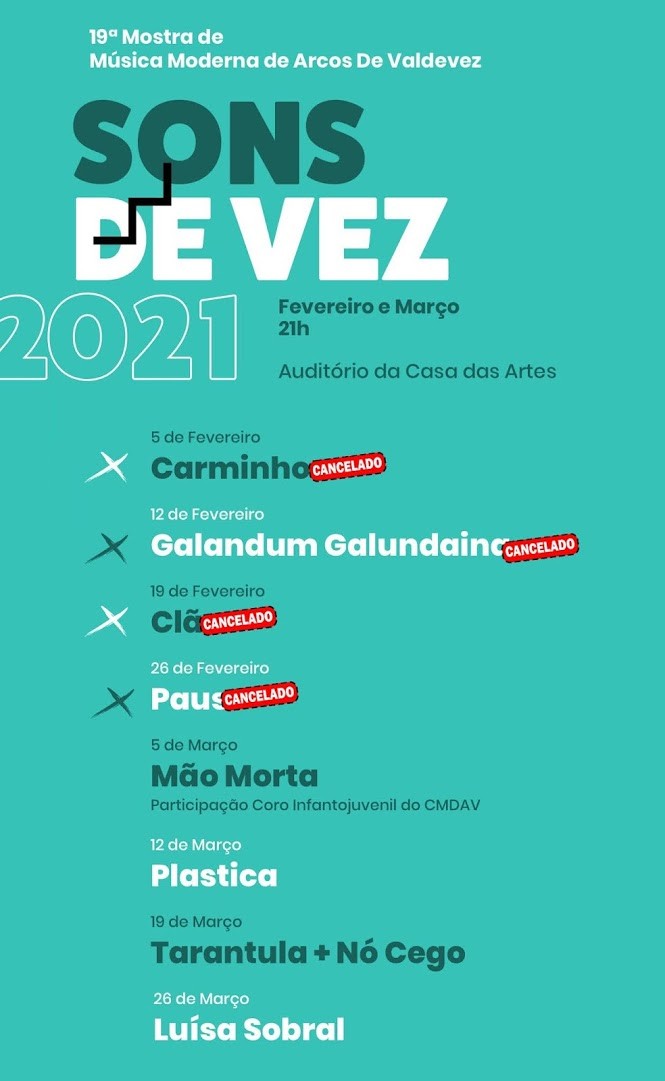 Assim, ficam canceladas as atuações de Carminho (na sexta-feira), Galandum Galandaina (12 de Fevereiro), Clã (19 de Fevereiro) e PAUS (26 de Fevereiro), que serão reagendadas para o presente ano, em data ainda a anunciar.